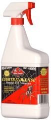 Do you get tired of finding cobwebs over and over again in nooks and corners of your home? Finally, there is a solution for you! Dr. T's Nature Products Cobweb Eliminator is an organic compliant product that is 100% natural, biodegradable, non-toxic and non-corrosive. In addition, it is pet safe and plant safe. This product can be used in hospitals, restaurants, public buildings and more! Cobweb Eliminator eliminates and inhibits future cobwebs from paint, metal, fiberglass, concrete and masonry. Cobwebs form when errant pieces of silk left behind by spiders and other insects collect dust. This product works by attacking a cobweb's attachment points, weakening the connection. By removing the cobweb and its debris, Cobweb Eliminator reduces fire hazards and respiratory problems. Just spray the cobweb-plagued area and remove the cobweb with broom or cloth. No rinsing needed after application. Application eliminates dust, pollen and insects. The non-stick and non-stain composition adheres to any surface, preventing cobweb eruption for up to six months! This 32 fl. oz. concentrate covers up to 275 sq. ft. For longer term cobweb control look no further than this product's 1 gallon presentation (Cobweb Eliminator DT 371). What It Controls Dr. T's Nature Products Cobweb Eliminator eliminates and inhibits future cobwebs from paint, metal, fiberglass, concrete and masonry. Cobwebs form when errant pieces of silk left behind by spiders and other insects collect dust. Cobweb Eliminator can be used indoor or outdoors and will not stain wood, painted surfaces, vinyl, fiberglass, concrete or masonry. How It Works Dr. T's Nature Products Cobweb Eliminator is the only patented product formulated to eliminate and prevent cobwebs by deterring their formation. The proven formula works by breaking down cobweb attachment points. Cobweb Eliminator is 100% natural, FDA/USDA approved and is people and plant/pet safe. For best results, use a sponge to apply to metal surfaces and a stiff bro