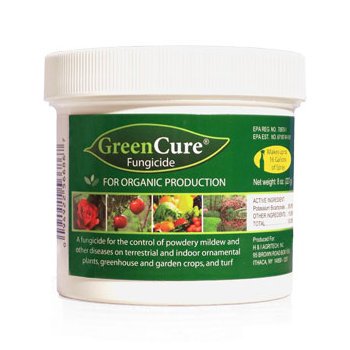 What is GreenCure?GreenCure is a potassium bicarbonate-based fungicide that has been proven to cure and prevent powdery mildew, blackspot, downy mildew, blights, molds and other plant diseases. GreenCure® is as effective or better than competitive products, can be more economical and best of all, it's kinder to you and the environment.GreenCure fungicide is recommended for use on over 150 different flowers, trees, houseplants, fruits, vegetables, and turfs. Unlike other fungicides, GreenCure® is not a toxic chemical. Its active ingredient, potassium bicarbonate, is commonly used in food products, but in this patented formula it is a highly effective, more sensible fungicide.Kills powdery mildew and other diseases on contact and provides up to 2 weeks of residual protection. * Alternative to harsh chemicals * Proven effective in 200 university trials and 10 years in organic agriculture * Fully dissolves in water * Odorless - no foul smell * Sprays on evenly and sticks to plant surfaces * Fruit and vegetables can be harvested as soon as 1 hour after spraying * Does not restrict plant growth * Economical * Does not accumulate in soil * Compatible with many beneficial insects * For Organic Production GreenCure fully dissolves in water and is easily sprayed on leaves, flowers, stems and branches. The patented formula contains just the right amount of potassium bicarbonate and surfactants so that there is no unsightly residue. It dries quickly and it dries clean. Vegetables can be harvested within 1 hour of spraying.It spreads out evenly over leaves and provides complete coverage. Since "prevention is the best medicine" it is wise to apply GreenCure at the first sign of disease or even when environmental conditions are favorable to mildew. GreenCure kills mildew on contact and provides up to 2 weeks of preventive protection.Use GreenCure for organic gardening.Sold in 8oz container and makes up to 16 gallons of spray.