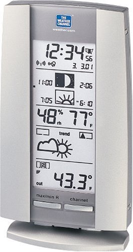 For avid outdoorspeople, boaters, or folks who just like to know what to expect, this wireless weather station provides all the stats for planning a day outside. The station reports the indoor humidity and temperature in Fahrenheit and Celsius for indoor locations and outdoor locations using a remote sensor. For more accurate outdoor readings, the base unit can receive information from up to three different sensors, which can each be placed up to 80 feet away. The weather station records the minimum and maximum temperatures and humidity readings within a 24-hour period and recalls them at your prompting. The device also calculates the setting and rising times of the sun and the moon for 45 United States cities and shows the current moon phase. A forecast icon on the LCD displays weather predictions for any 12- to 20-hour time period based on changing air pressure. For added convenience, the sun/moon weather station has a clock with the accurate date and an alarm clock with snooze. For precise time- and date-keeping, the gadget has a built-in antenna system that receives signals from the WWVB radio transmitter in Fort Collins, Colorado, which is in turn is regulated by the atomic clock. For easy programming of the clock or other functions, the metal panels on the sides of the station flip open to reveal six keys. The sun/moon wireless weather station requires two AA batteries for the receiver and another two for the remote and mounts on a wall or rests on a table for readouts. This unit is covered by a one-year warranty. --Cristina Vaamonde